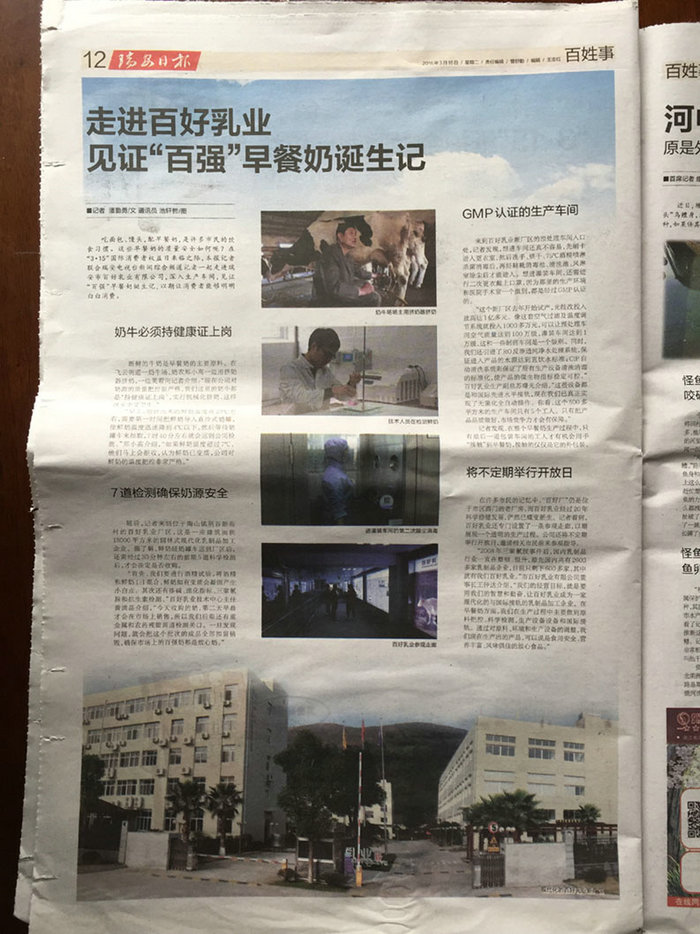 2016年3月15日,瑞安日报以整个版面刊登了题为《瑞安人每天早上喝的牛奶竟是这样做出来的!》,瑞安电视台红色台标“新闻综合”频道推出《本土早餐奶安全吗?记者带你实地去见证“百强奶”》的视频和文章。这些新闻资讯又同时在网络、微信等渠道迅速传播。引起了社会的反响,早餐奶的质量和声誉广受群众赞誉。
