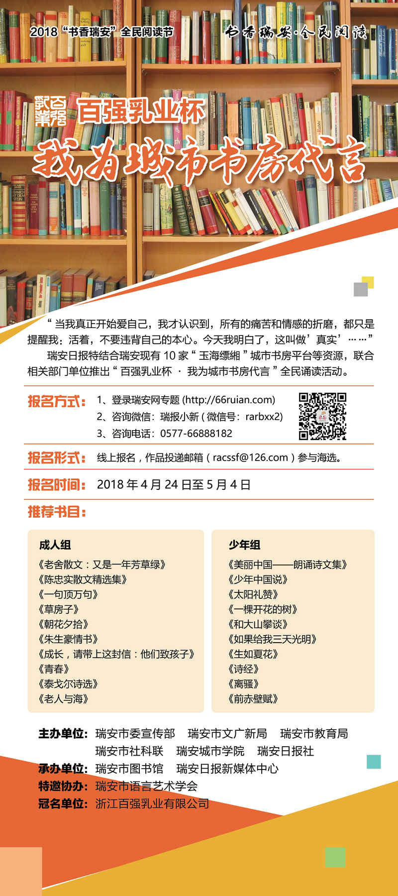 4月23日是世界读书日,瑞安市启动2018“书香瑞安”全民阅读节活动。浙江百强乳业有限公司独家冠名 “我为城市书房代言”活动,助力打造书香瑞安、至美瑞安。