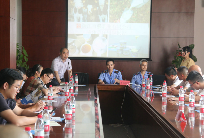 随后召开会议,会议由市场监督管理局陶山所副所长朱礼主持。百强乳业生产副总苏曙光代表公司在会上作了《食品安全主体责任履职报告》,从企业运行机制、管理模式、质量管控、售后服务、节能环保、企业文化等方面介绍了公司履行食品安全主体责任的情况