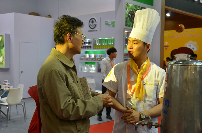 △上海烘焙展——陈杨威在向客户介绍产品△