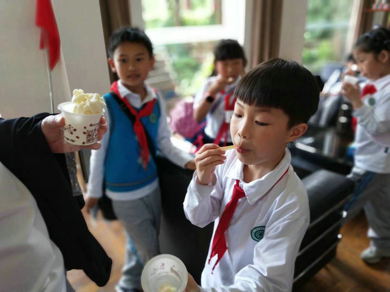 小朋友们先来到三楼多功能厅,在学校徐老师主持下拉开活动的序幕。大家看了百强宣传片,听了关于企业发展概况、炼乳的起源和制造知识。小朋友们很认真哟,做着笔记呢。当技术员在现场用酒精做“新鲜奶及过期奶”检验时,同学们一个个跃跃欲试,争着要看结果。