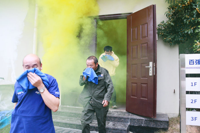 理论培训后,活动转入户外实战演练环节。专家团设置模拟火源点,并协调消防车、灭火器等设备供员工实操。随着警报响起,员工们迅速反应,用事先准备好的湿毛巾捂住口鼻,弯腰低姿沿着疏散通道快速撤离至指定集合点。