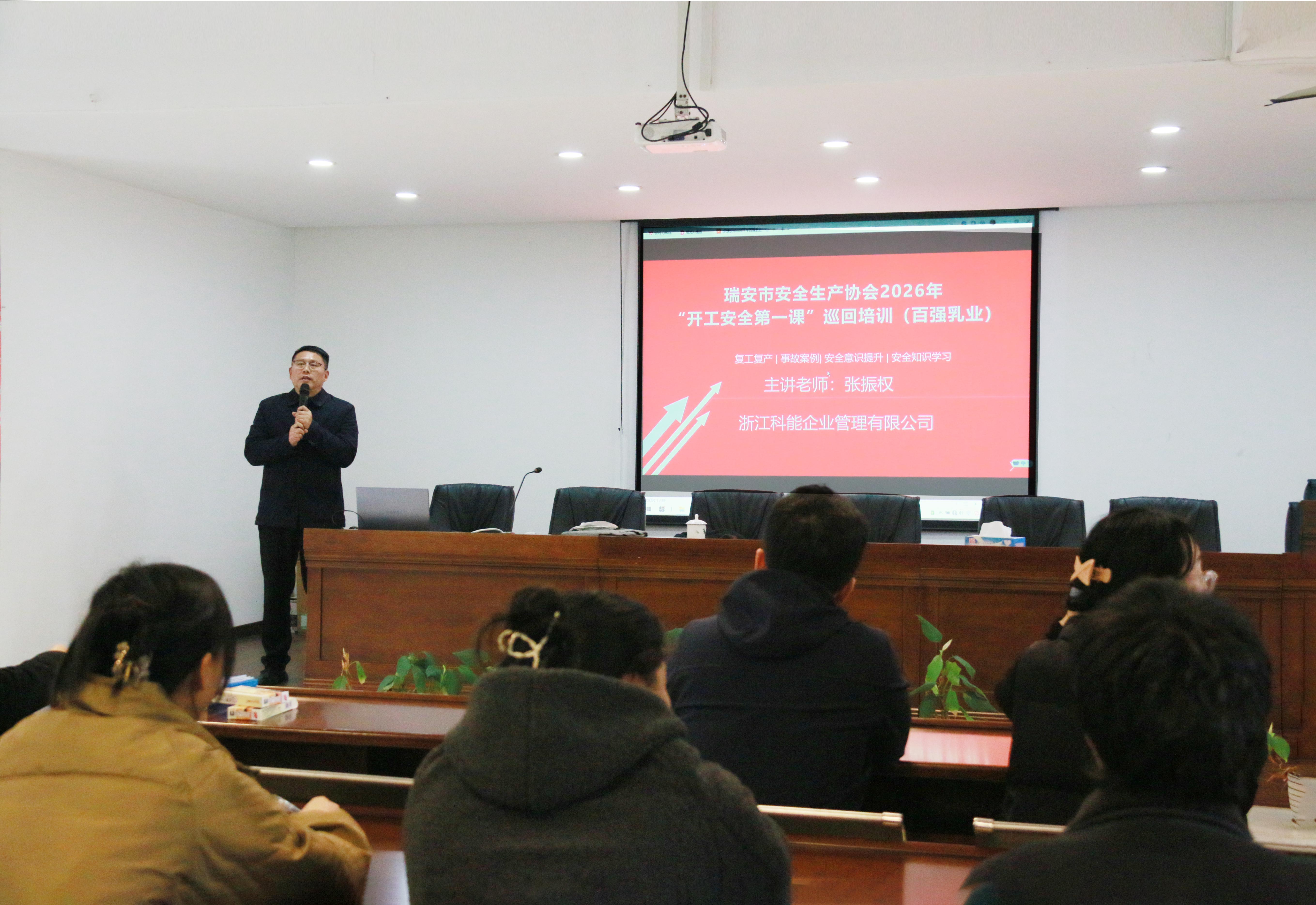 为了强化员工安全生产意识,确保企业全年安全生产工作开好局、起好步,2026年3月5日,浙江百强乳业有限公司组织全体员工开展"开工安全第一课"专题培训。本次培训是瑞安市安全生产协会2026年"开工安全第一课"巡回培训的分会场之一,特聘浙江科能企业管理有限公司专业培训师张振权进行授课。